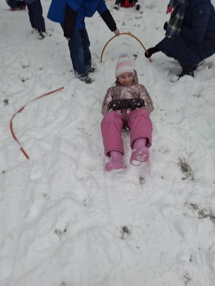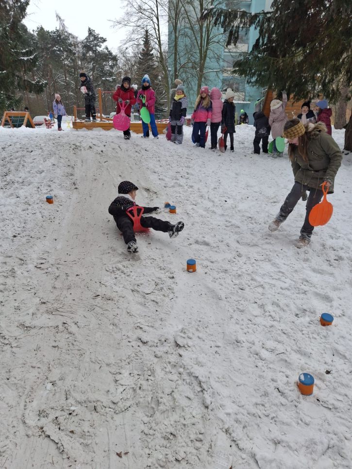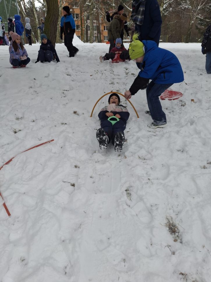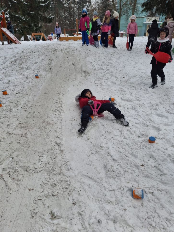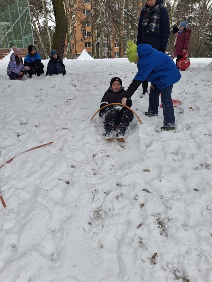 Letos se nám konečně povedlo počasí na naší zimní olympiádu, abychom si ji mohli udělat venku. Na zasněžené zahradě si děti udělaly ve sněhu anděla, sjížděly kopec na lopatách,