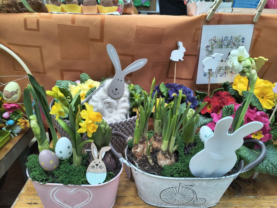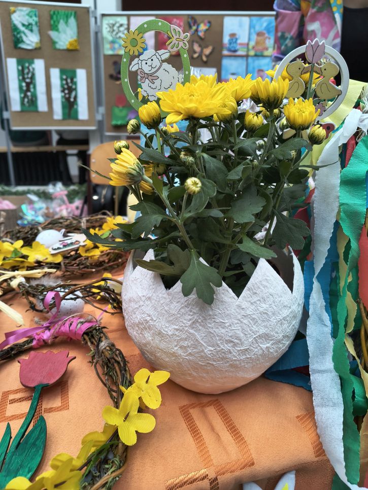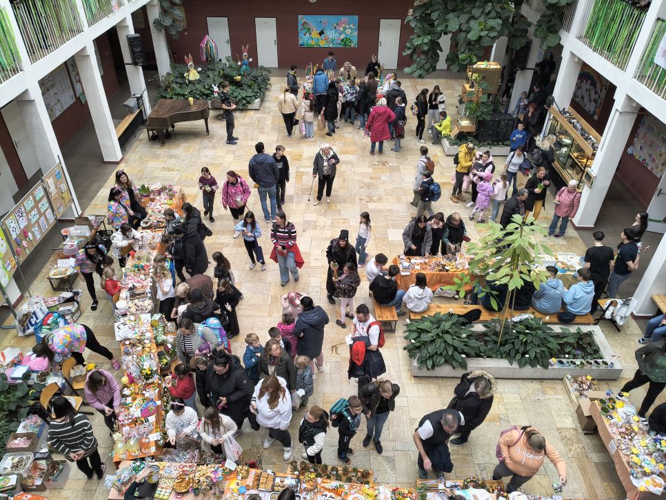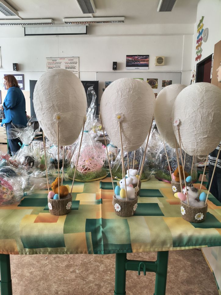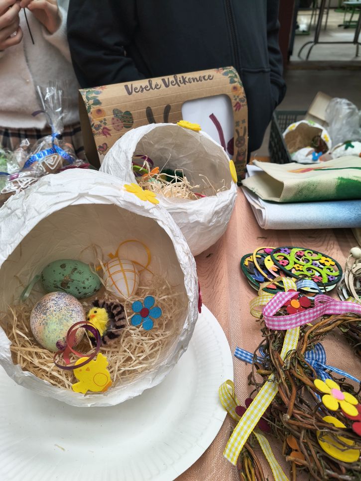 Rodiče a přátelé školy si mohli přijít nakoupit dobroty sladké i slané a mohli si vybírat mezi nápaditými velikonočními dekoracemi od zajíčků, různých napichováků až po oseníčka. A kdo nechtěl nakupovat, mohl si v klidu posedět v kavárně u jezírka.