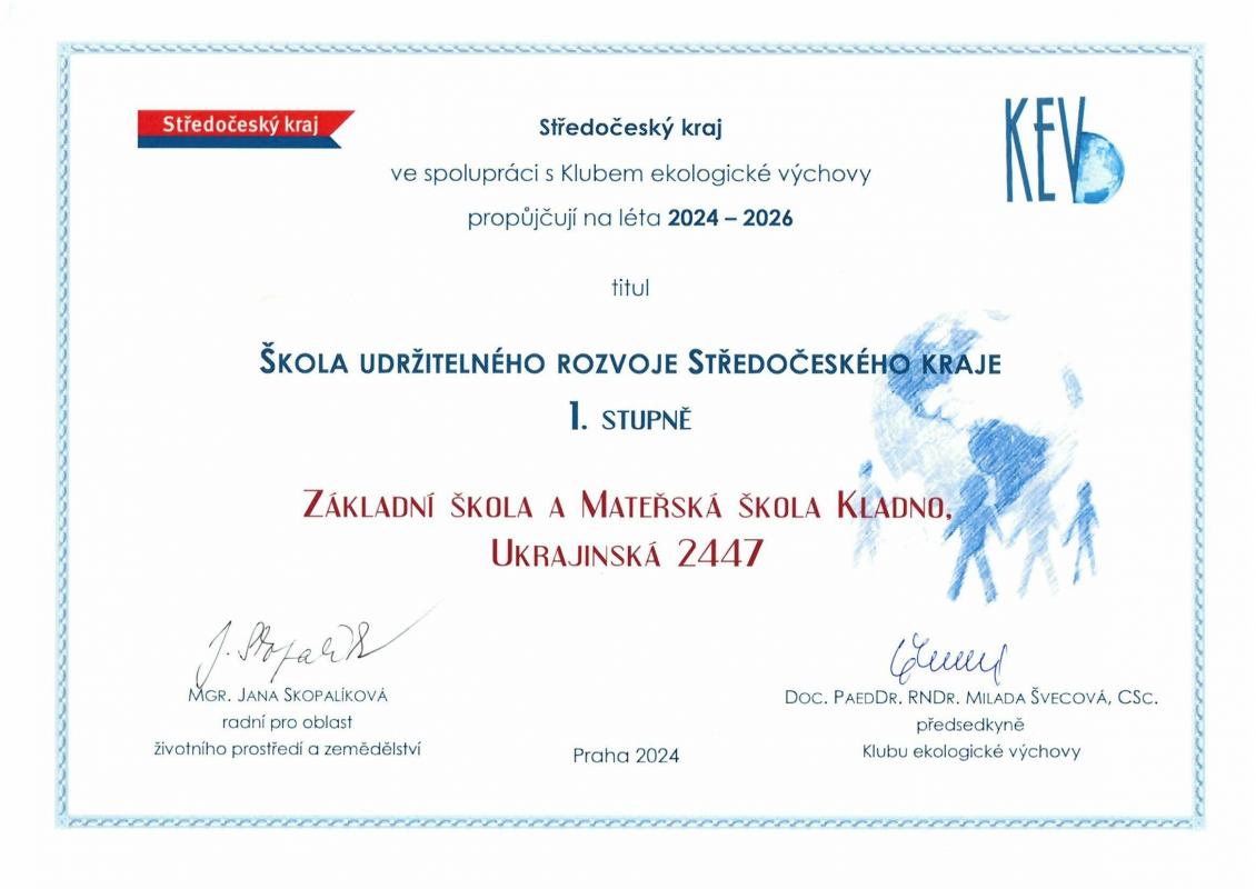 Certifikát byl škole předán v rámci konání 16. setkání koordinátorů environmentální výchovy Středočeského kraje dne 27. 3. 2024 v prostorách Krajského úřadu SK.